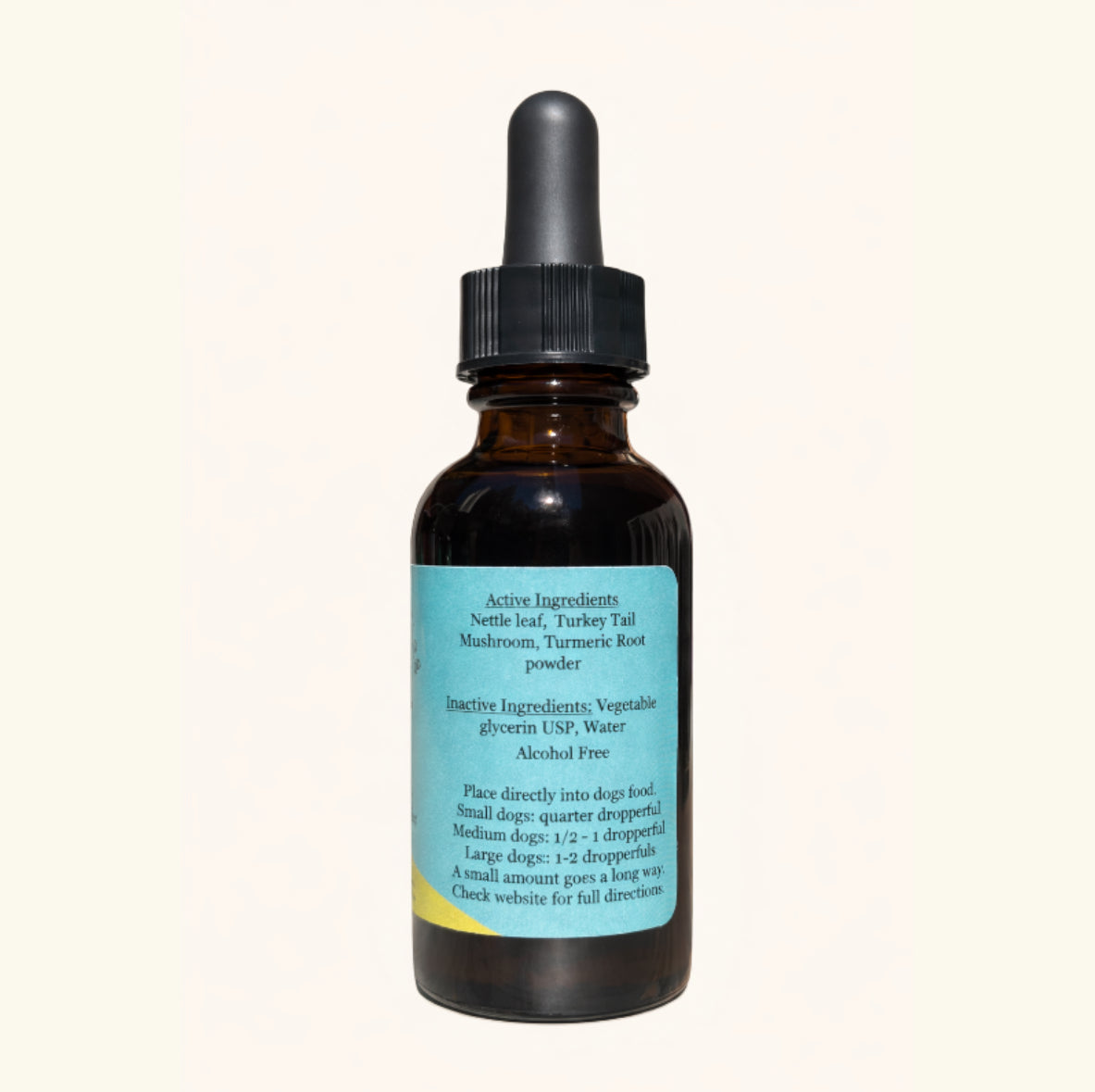 Allergy Relief Extract is a 100% organic herbal dog allergy relief tincture formulated to ease itchy skin, reduce inflammation, and balance the immune system naturally. This alcohol-free blend combines nettle leaf, turmeric root, and turkey tail mushroom to target allergy symptoms at the root, so your dog can enjoy more comfort all season long.