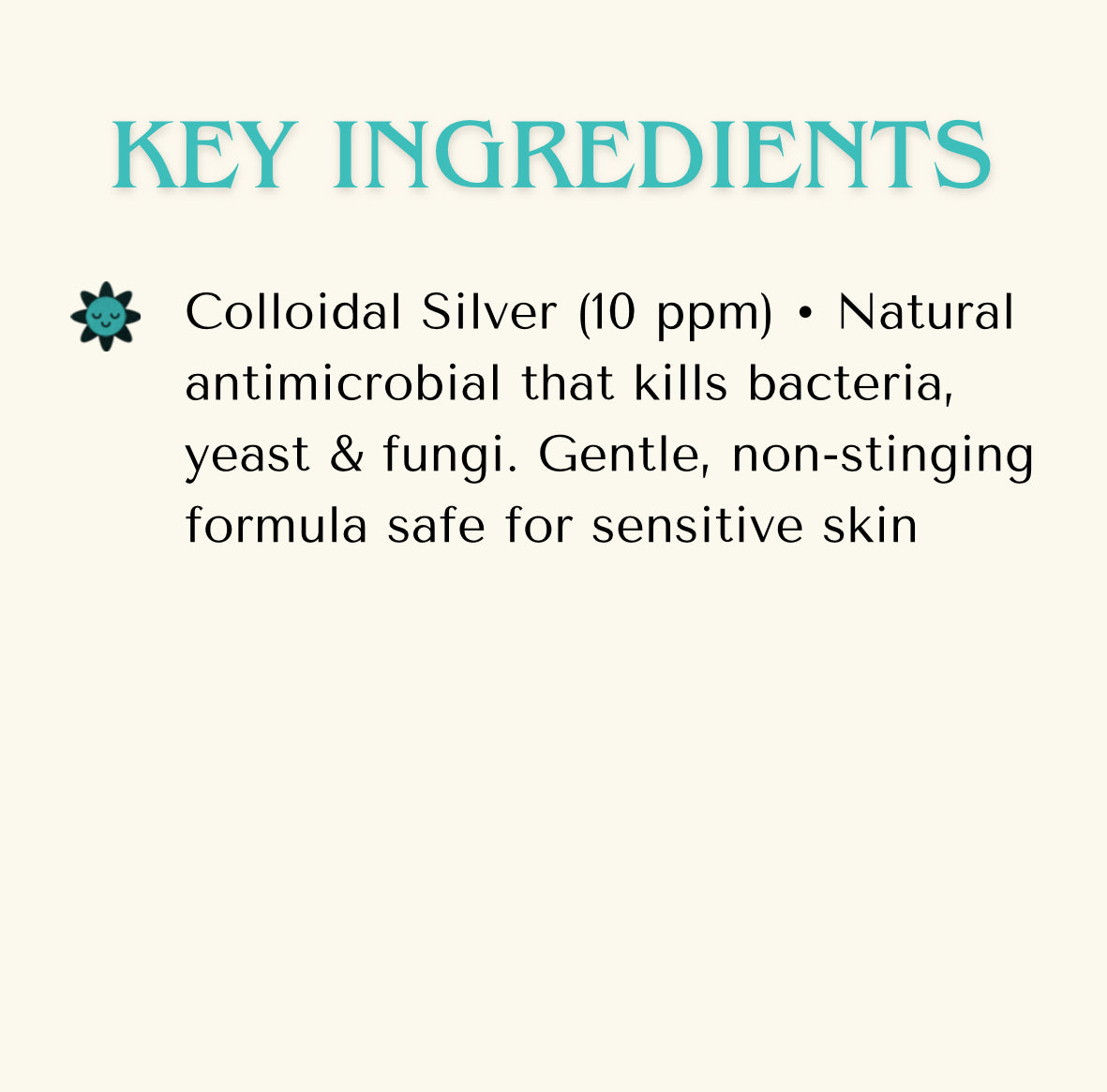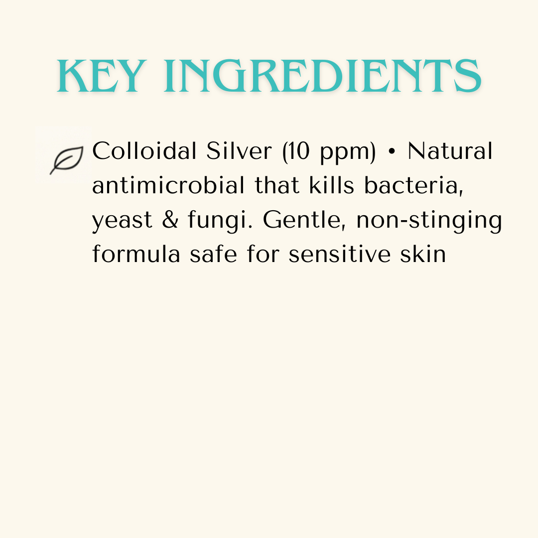 - Colloidal Silver (10 ppm) — Natural antimicrobial action helps eliminate bacteria and yeast while calming irritation.