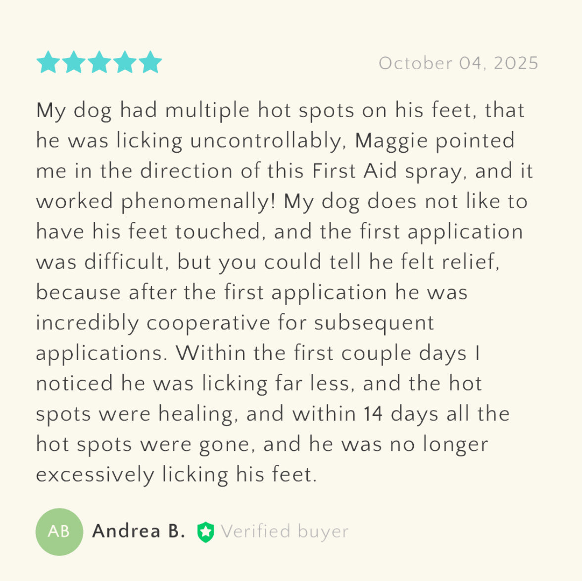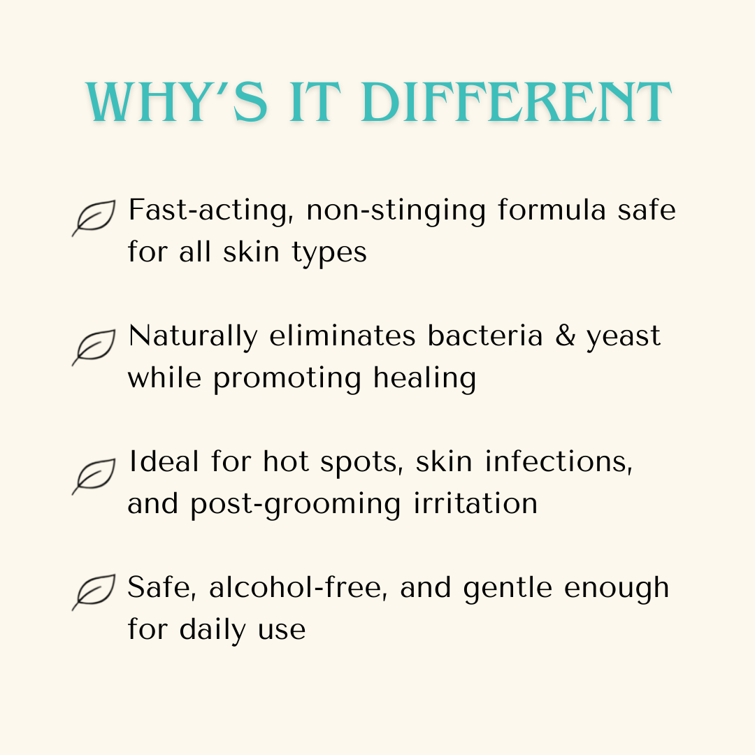 - Use 1–2x daily for hot spots, rashes, or yeast flare-ups.