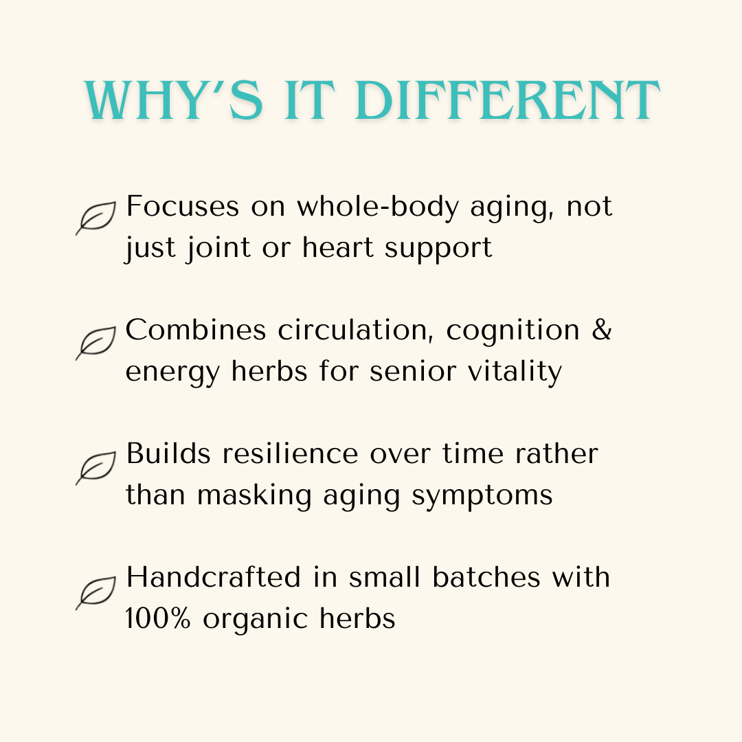 Includes nettle, spirulina, astragalus, burdock, slippery elm, and oatstraw—all chosen for senior wellness support.