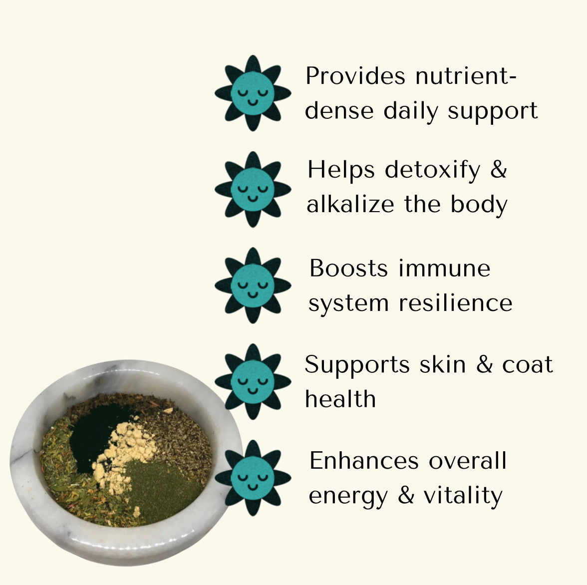 A premium herbal blend of nutrient-rich greens designed to enhance your dog's or cat’s daily nutrition.